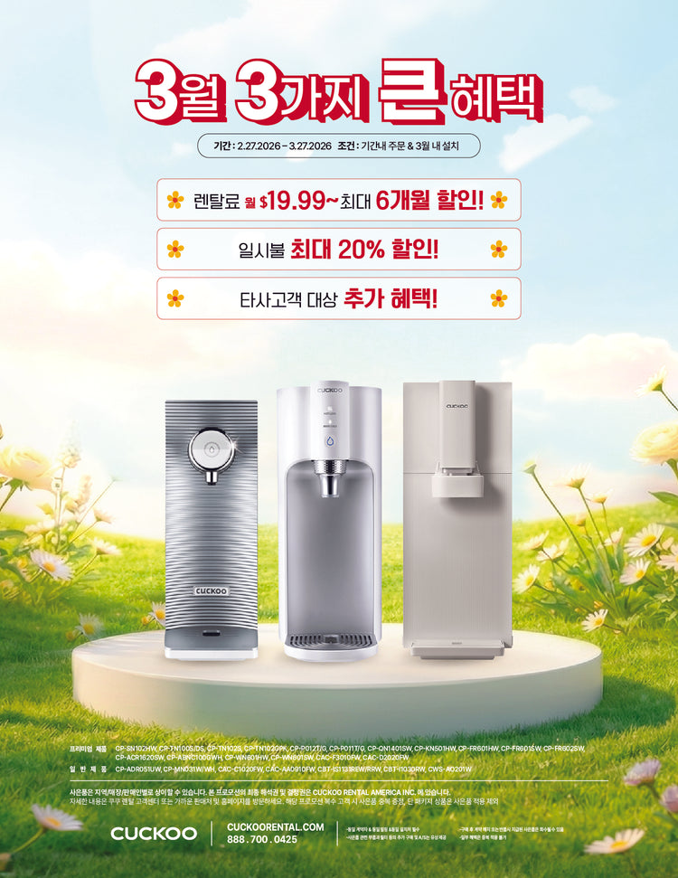 사은품은 지역/매장/판매인별로 상이할 수 있습니다. 본 프로모션의 최종 해석권 및 결정권은 CUCKOO RENTAL AMERICA INC.에 있습니다. 자세한 내용은 쿠쿠 렌탈 고객 센터 또는 가까운 판매처에 문의하세요.